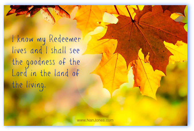 Praise God for the Body of Christ. Praise God for my family and friends who have sheltered me in the storm. My season of letting go is here. The beautiful burst of color is because I know my Redeemer lives and I shall see the goodness of the Lord in the land of the living. And as I wait for this season to pass, my roots will grow deep and strong and I will rejoice in the shelter of my friends.