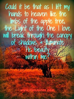 Hi Nan! What beautiful words to read this morning. I want to lift up my hands to the heavens and feel the warmth of his love! I really liked the image of the light 'squeezing' itself through to the apple tree. It shows me that no matter how much crud I am surrounded in, he will find me and fill me.
